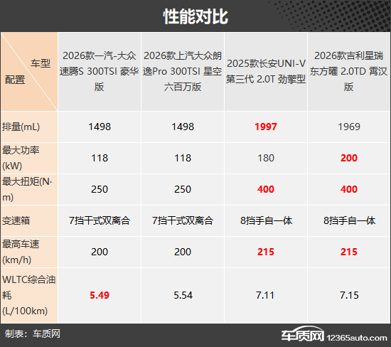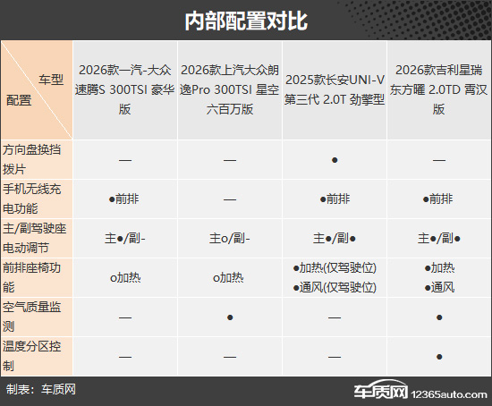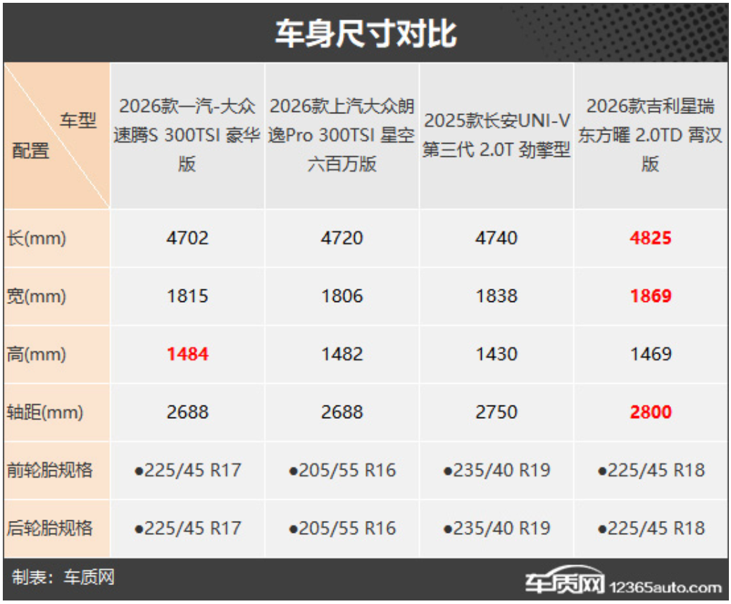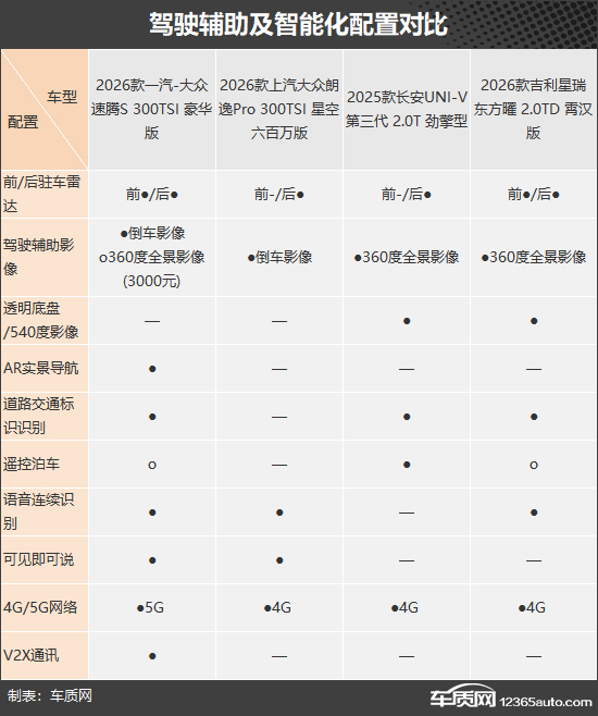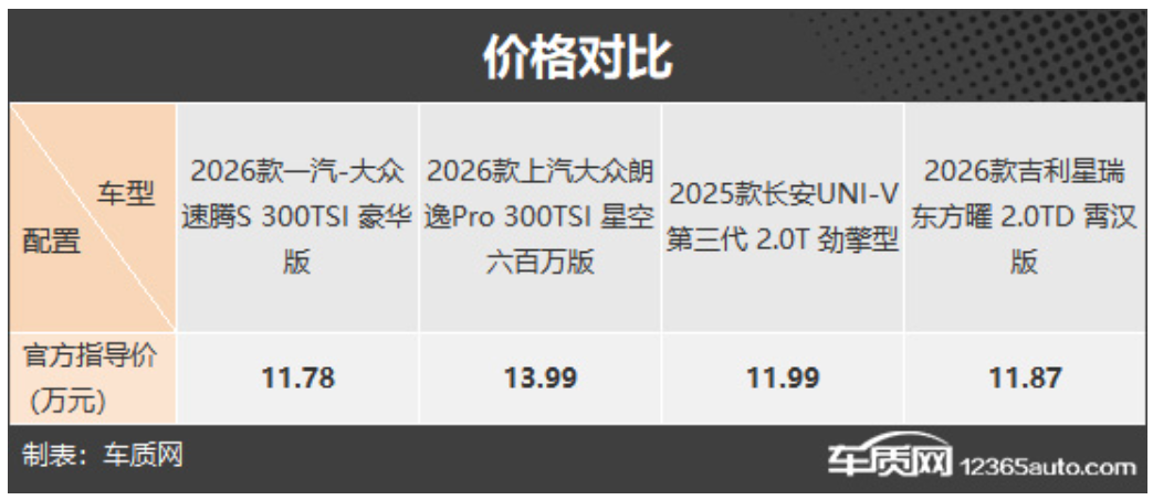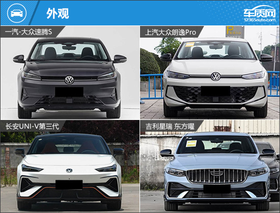 本次挑选的四款车型分别为2026款一汽-大众速腾S 300TSI 豪华版(以下称:一汽-大众速腾S)、2026款上汽大众朗逸Pro 300TSI 星空六百万版(以下称:上汽大众朗逸Pro)、2025款长安UNI-V第三代 2.0T 劲擎型(以下称:长安UNI-V第三代)和2026款吉利星瑞 东方曜 2.0TD 霄汉版(以下称:吉利星瑞 东方曜)。四款车型的市场定位比较接近,价格差距也不是很大。