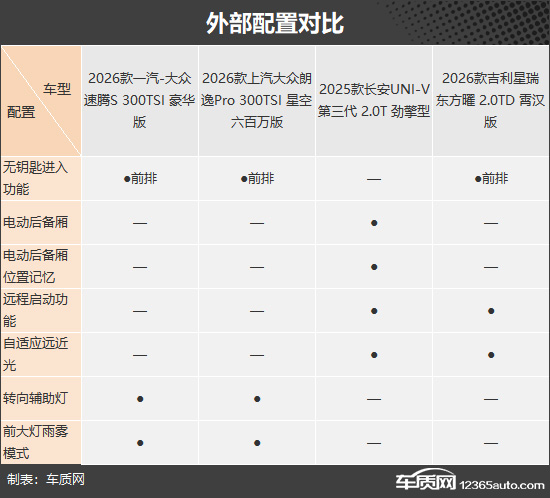 外部配置方面,长安UNI-V第三代表现亮眼,独享电动后备厢、电动后备厢位置记忆,并配备远程启动功能与自适应远近光,用车便利性更佳。两款大众车型则凭借转向辅助灯与前大灯雨雾模式,在一定程度上提升了照明效果,缩小了与长安UNI-V第三代的配置差距。