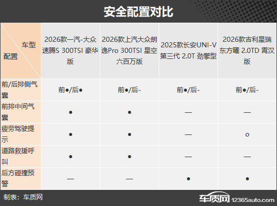 安全配置方面,一汽-大众速腾S在被动安全配置上明显优于另外三款车型,独享后排侧气囊,同时配备前排中间气囊,防护更全面。主动安全配置方面,四款车型各有侧重。两款大众品牌车型的优势是配备疲劳驾驶提示与道路救援呼叫功能,而长安UNI-V第三代和吉利星瑞 东方曜则是提供后方碰撞预警,进一步提升行车安全性。