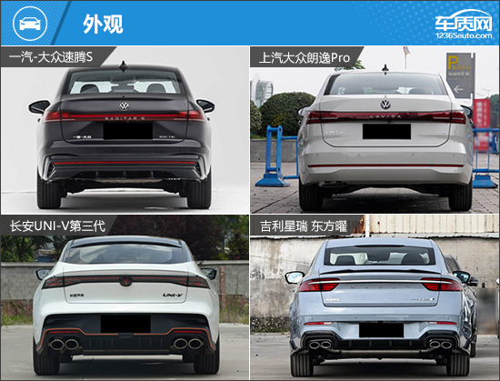 车尾部分,一汽-大众速腾S与上汽大众朗逸Pro造型较为相近,均配备贯穿式LED尾灯组,与车头设计风格形成呼应。长安UNI-V第三代和吉利星瑞 东方曜更侧重运动氛围感的营造,车尾均采用赛车化扩散器与双边共四出排气布局,视觉攻击性更强。